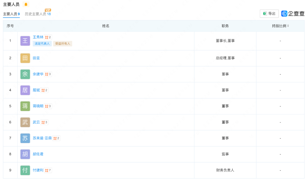 根據企查查顯示,含董事長、總經理在內共6位高層卸任。目前,主要領導為9人。其中,王秀林任董事長、田亞任總經理。