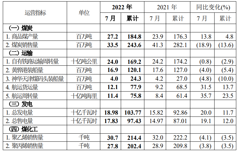 中國神華發(fā)布2022年7月份主要運(yùn)營數(shù)據(jù)。2022年7月,中國神華總發(fā)電量189.8億千瓦時,同比增長20.0%;2022年1-7月,中國神華總發(fā)電量1037.7億千瓦時,同比增長11.7%。