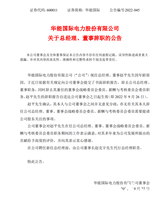 9月27日,華能國際發(fā)布關(guān)于總經(jīng)理、董事辭職的公告。華能國際現(xiàn)任總經(jīng)理、董事趙平先生因年齡原因,于近日依據(jù)有關(guān)規(guī)定向公司董事會提交了書面辭職報告,辭去公司總經(jīng)理、董事職務(wù),同時辭去其兼任的董事會戰(zhàn)略委員會委員、薪酬與考核委員會委員職務(wù)。趙平先生的辭職報告自送達公司董事會之日起生效(即2022年9月26日)。