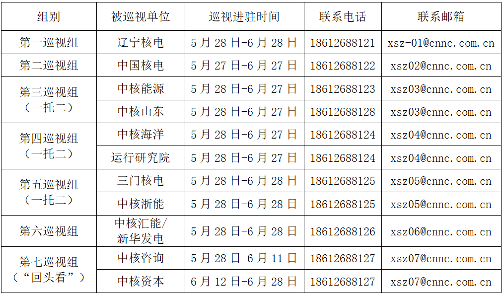 中核集團(tuán)黨組第二輪巡視進(jìn)駐一覽表