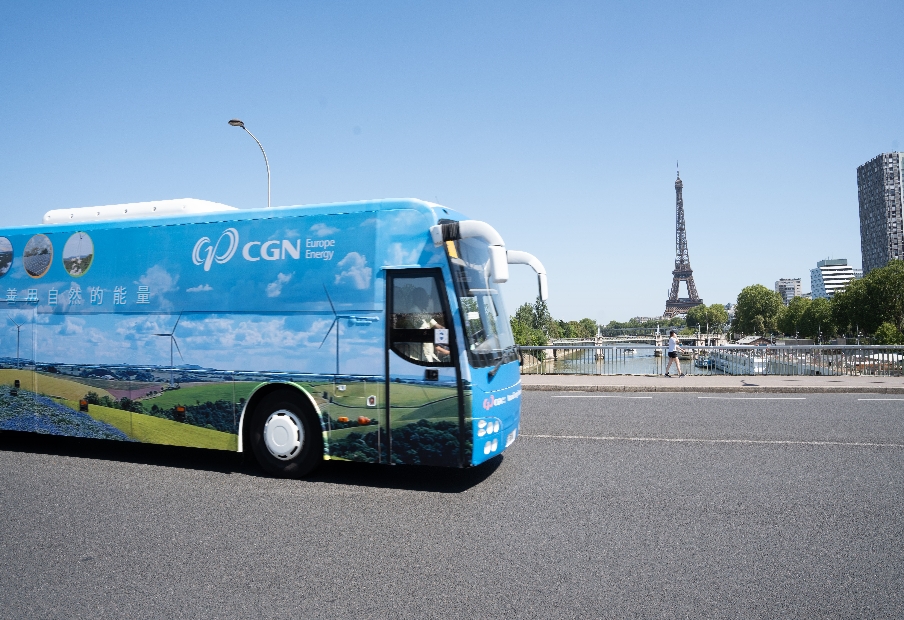 印有中廣核風(fēng)場的旅游大巴穿梭在巴黎街頭