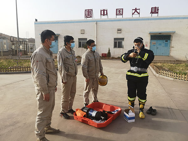 首先開展的是干粉滅火器實操演練。運維人員取出4具即將送檢的滅火器,用小推車裝好干柴放置在空曠地點,駐站人員講解了滅火器檢查方法和使用流程后,在確保安全的情況下將小推車內(nèi)的干柴點燃。一名工作人員用滅火器將車內(nèi)的火焰撲滅,再重新點燃,下一名人員繼續(xù)操作,最終達到參訓(xùn)人員全部能夠熟練使用滅火器的目的;其次,開展正壓呼吸器使用實操演練。在每個人都熟練掌握說明書上使用步驟和注意事項后,每名工作人員都穿戴正壓呼吸器一次,如果穿戴流程錯誤立即糾正并重新穿戴;再次,開展消防戰(zhàn)斗服穿戴實操演練。有火電消防工作經(jīng)驗的人員對戰(zhàn)斗服使用步驟進行詳細講解,每名工作人員都穿戴消防戰(zhàn)斗服一次,達到全員均能熟練穿戴的目的;最后,所有參訓(xùn)人員都組裝并佩戴防毒面具一次。