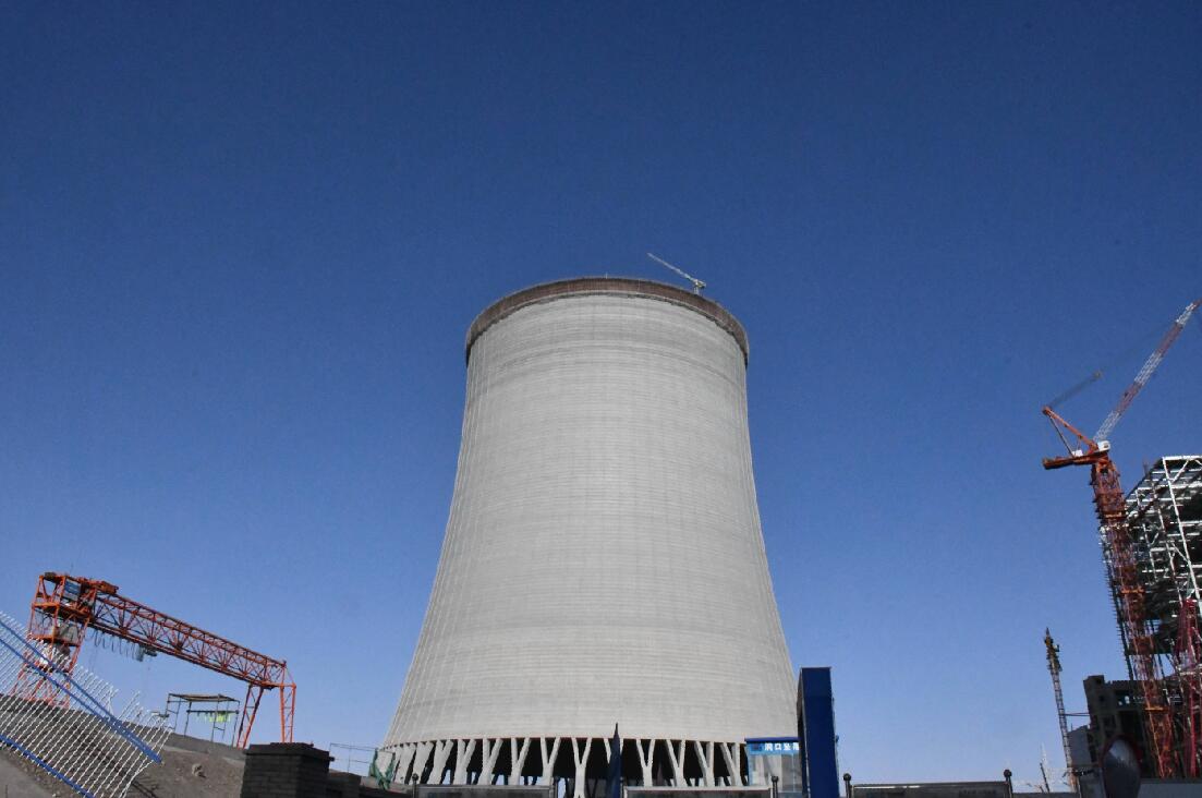甘肅電投常樂電廠項目超大型自然通風(fēng)間接空冷冷卻塔設(shè)計屬國內(nèi)一流。四號塔身零米直徑為163米,塔高215米,進(jìn)風(fēng)口高度29米,進(jìn)風(fēng)口直徑143.8米。由基礎(chǔ)、X柱、環(huán)梁、塔筒等部分組成,于2021年7月上旬開工,X柱采用清水混凝土澆筑,整體澆筑共使用87753立方米混凝土,到頂后的間冷塔筒壁內(nèi)實外光、曲線流暢、模板接茬平整。塔筒為雙曲線形現(xiàn)澆鋼筋混凝土殼體結(jié)構(gòu),這種設(shè)計有效解決了瓜州縣大風(fēng)地區(qū)間冷塔設(shè)計和運行等技術(shù)難題。