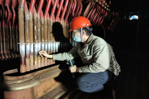 11:30,工程部值班人員在鍋爐頂棚屏式過熱器抽查爐壁滲透檢測結果。