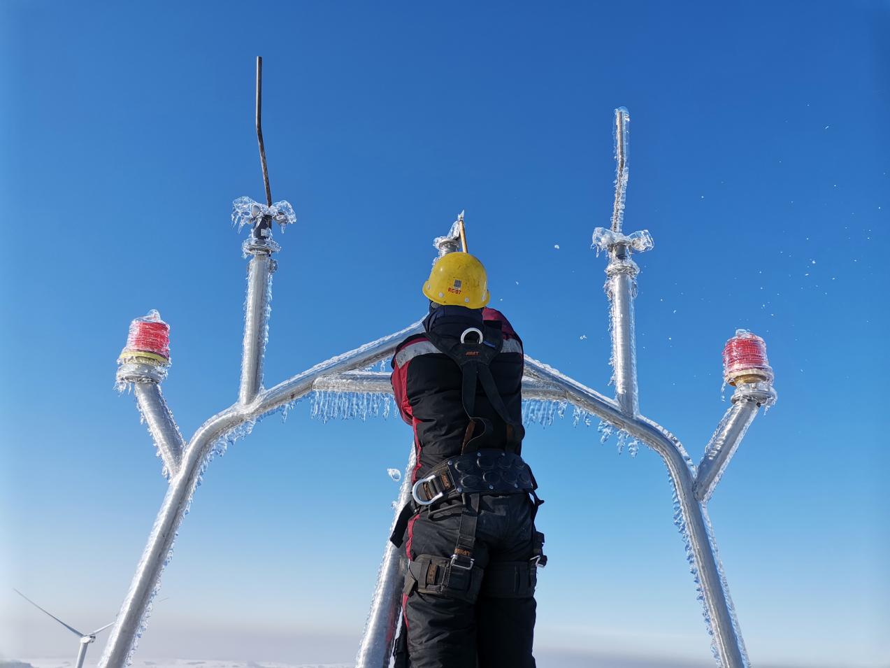 11月11日至12日,陽光透過薄薄的云層,照耀著白茫茫的大地,反射出銀色的光芒。風機逐漸恢復運行,在重力和風機葉片旋轉的作用下,裹冰會從葉片上脫落,由于受旋轉葉片的離心力作用,這些冰在沒有障礙物遮擋的情況下會被拋出數(shù)百米遠,存在安全隱患。風電場隨即組織人員挨家挨戶告訴村民,近期不得靠近風機,注意人身安全。之后開展機組風速儀、風向標除冰工作,全面降低機組不可用時間,保障機組供電穩(wěn)定可靠。本次除冰消缺充分利用上海電氣風機監(jiān)控系統(tǒng)后臺,通過對比機組風速和風向、功率等數(shù)據(jù),分析判斷機組覆冰情況,對因雨雪冰凍天氣導致的風速儀、風向標覆冰從而影響機組功率的問題,及時派出“破冰突擊隊”。但是機艙頂部由于積雪、結冰,變得十分光滑。工作人員佩戴好安全帶,掛好雙鉤,迎難而上,勇敢破冰。同時也對加熱器、溫度傳感器及相關回路進行細致檢查,對無法正常運行的加熱器進行及時更換,確保設備加熱良好,回路接線無松動,風速儀、風向標工作正常。