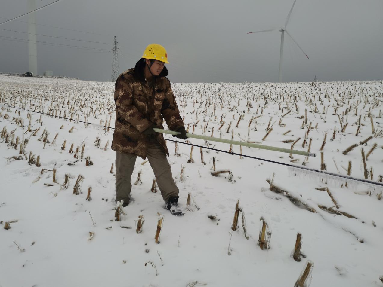 11月10日,瑟瑟寒風能吹開地上的積雪,卻無法阻止破冰小隊的腳步。這場持續(xù)兩天的雨雪剛一停,風電場立即組織人員兵分兩路,迅速趕往現(xiàn)場。一組對升壓站35kV側通訊光纖、220kV側高壓一次設備采取人工打冰的方式對覆冰部位進行處理,確保線路安全,以及再對升壓站電纜溝蓋板進行清掃。另一組首先對風機變頻器冷卻風扇散熱網(wǎng)上的“冰罩”進行破冰。避免風機復位運行后,變頻器冷卻風扇散熱不及時的情況,導致設備損壞。之后再對線路進行檢查,因受大風和凍雨混合雙打,集電線路被冰包裹得嚴嚴實實的。經(jīng)檢查后并無損壞,否則電線結冰后,既要承受冰掛的重量,加上風的影響,致使電線被壓斷。同時,電塔也可能會承受較往常多十幾倍的電線重量,從而造成傾倒或折斷。還好只是塔架固定掉落,加上冰的重量才“葛優(yōu)躺”在地面上?,F(xiàn)場用絕緣桿進行人工敲打。隨著敲打的進行,電纜逐漸升起,這也減少了發(fā)生事故的可能。
