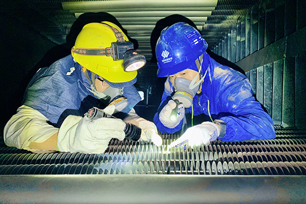 圖為鍋爐專業(yè)點檢人員正在進行省煤器區(qū)域防磨防爆檢查