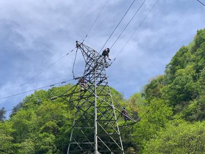 此次維保檢修的二郎壩發(fā)電35kV臥天架空輸配電線路全長約18公里,共有桿塔43級,其中鐵塔22級,混凝土水泥桿塔21級,均為山區(qū)架空線路,且位于陜南山區(qū),叢林密布、道路濕滑,檢修維保工作難度大。施工前,電力運營提前抽調(diào)專業(yè)技術(shù)人員對現(xiàn)場情況進行實地勘察,就天氣情況、檢修方案、危險點進行分析討論,梳理設備缺陷隱患,并制定了完善的檢修方案及“三措兩案”。檢修人員披荊斬棘、逐桿逐級檢修,共計消除桿塔金具缺陷339條、更換破損絕緣子5片、更換避雷器1組,有效地提高了輸電線路設備的健康和運行水平,以優(yōu)質(zhì)、高效的檢修成果確保了業(yè)主方輸電線路安全可靠運行。