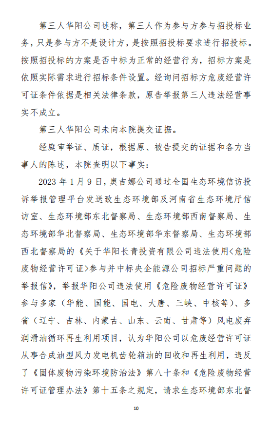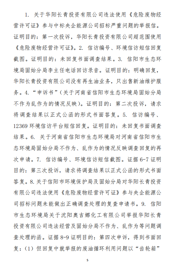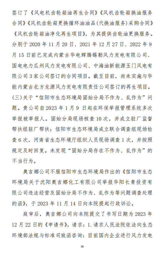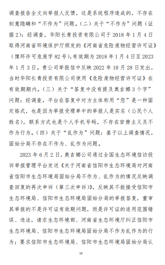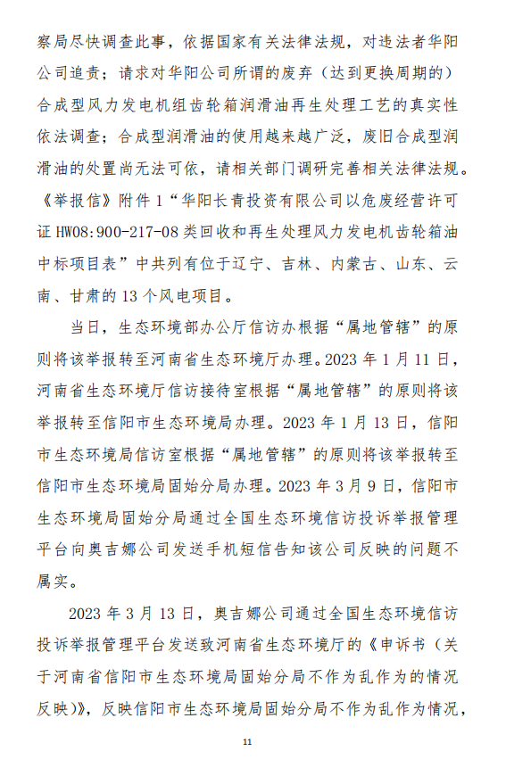 2023年3月9日,奧吉娜公司收到固始分局通過12369環(huán)境信訪平臺的短信答復:“反映問題不屬實”。3月10日,奧吉娜公司向固始分局負責人電話詢問,其解釋稱:經(jīng)調(diào)查核實,華陽長青公司沒有再生風電潤滑油銷售,出售的是新油。否定了奧吉娜公司的舉報內(nèi)容。對此,奧吉娜公司表示強烈不滿。3月11日,奧吉娜公司向環(huán)境部投訴固始分局的不作為和亂作為。2023年5月26日,奧吉娜公司收到12369環(huán)境信訪平臺的短信答復。答復部門為信陽環(huán)境局。令人啼笑皆非的是,答復稱,華陽長青的許可證有效期沒有問題,與舉報內(nèi)容風馬牛不相及。2023年6月13日,奧吉娜公司再次向環(huán)境部提出申訴,指出,奧吉娜舉報的不是許可證有效期問題,而是許可證的適用范圍錯誤、違法。2023年7月27日,奧吉娜公司收到回復稱,經(jīng)信陽市生態(tài)環(huán)境局現(xiàn)場檢查,未發(fā)現(xiàn)固始分局不作為情況。2023年8月3日,奧吉娜公司向河南省生態(tài)環(huán)境廳(以下稱:環(huán)境廳)舉報信陽環(huán)境局包庇固始分局的行為。環(huán)境廳對此高度重視,有關處長和奧吉娜公司負責人進行了面談。2023年9月13日,信陽環(huán)境局向奧吉娜公司致《信陽市生態(tài)環(huán)境局關于沈陽奧吉娜化工有限公司舉報華陽長青投資有限公司違法經(jīng)營及固始分局不作為、亂作為等問題調(diào)查處理的函》。函中:一是,以“齒輪箱”替換“齒輪箱油”,偷換概念;二是,做出了廢風電合成(齒輪)油不屬于危險廢物的結(jié)論;三是,未發(fā)現(xiàn)固始分局存在不作為、亂作為的不當行為。再次否定奧吉娜公司的舉報和投訴。