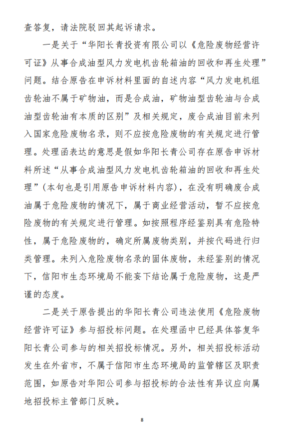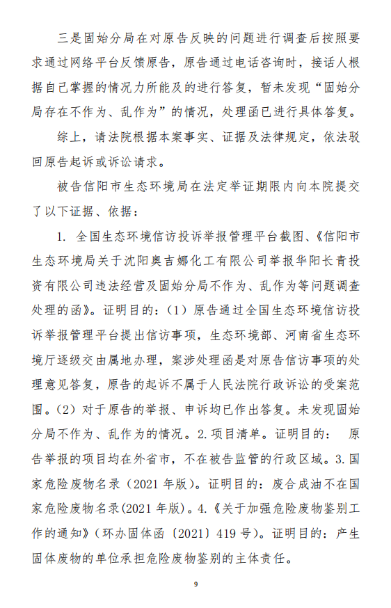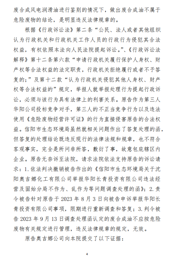 2、訴訟請求:請求人民法院判決撤銷被告作出的《信陽市生態(tài)環(huán)境局關于沈陽奧吉娜化工有限公司舉報華陽長青投資有限公司違法經(jīng)營及固始分局不作為、亂作為等問題調(diào)查處理的函》;責令被告對原告向被告舉報華陽長青投資有限公司事項,限期進行重新調(diào)查和答復;判令被告認定的廢合成油不應按危險廢物有關規(guī)定進行管理違反法律規(guī)章規(guī)定,無效。