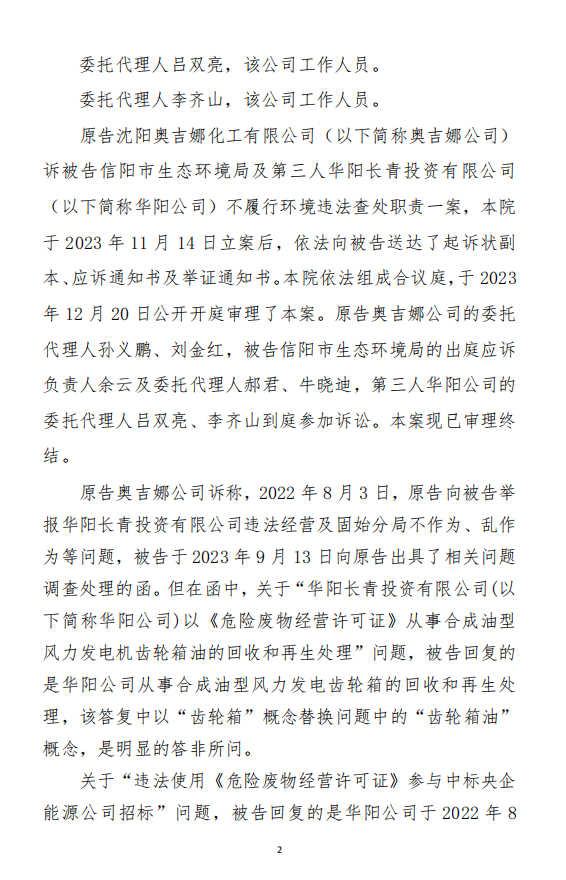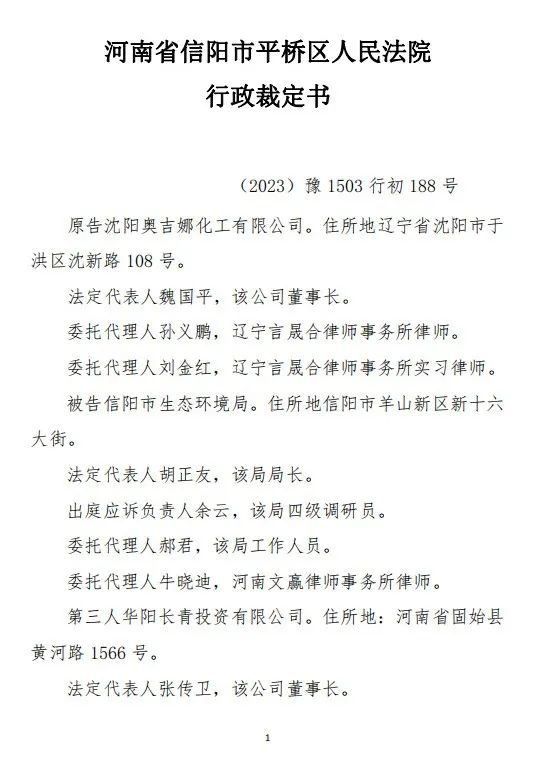 本網(wǎng)訊 中國風電潤滑油龍頭企業(yè)沈陽奧吉娜化工有限公司(下簡稱:奧吉娜公司或原告)訴信陽市生態(tài)環(huán)境局(被告)和第三人華陽長青投資有限公司(下簡稱:華陽長青公司)行政訴訟案,河南省信陽市平橋區(qū)人民法院于2023年12月29日作出行政裁定:駁回原告沈陽奧吉娜化工有限公司的起訴。