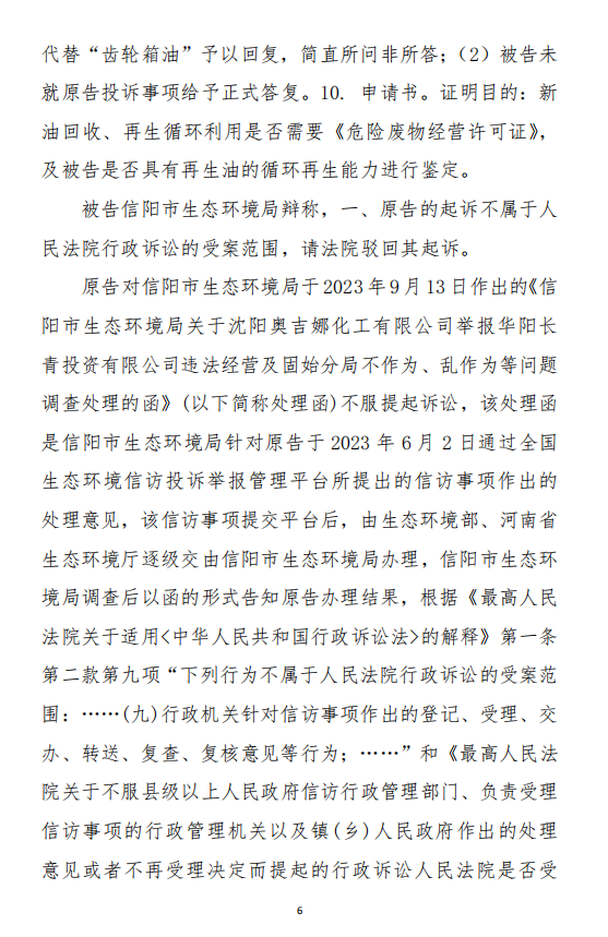 2023年10月18日,奧吉娜公司依據(jù)《行政訴訟法》和《行政訴訟法解釋》,將信陽市環(huán)境局和第三人華陽長青公司訴至信陽市平橋區(qū)人民法院,請求法院:1、判決撤銷被告作出的《信陽市生態(tài)環(huán)境局關于沈陽奧吉娜化工有限公司舉報華陽長青投資有限公司違法經(jīng)營及固始分局不作為、亂作為等問題調(diào)查處理的函》;2、責令被告針對原告于2023年8月3日向被告申訴舉報華陽長青投資有限公司事項,限期進行重新調(diào)查和答復;3、請求人民法院判令被告2023年9月13日調(diào)查處理函認定的廢合成油不應按危險廢物有關規(guī)定進行管理,違反法律規(guī)章的規(guī)定,無效。