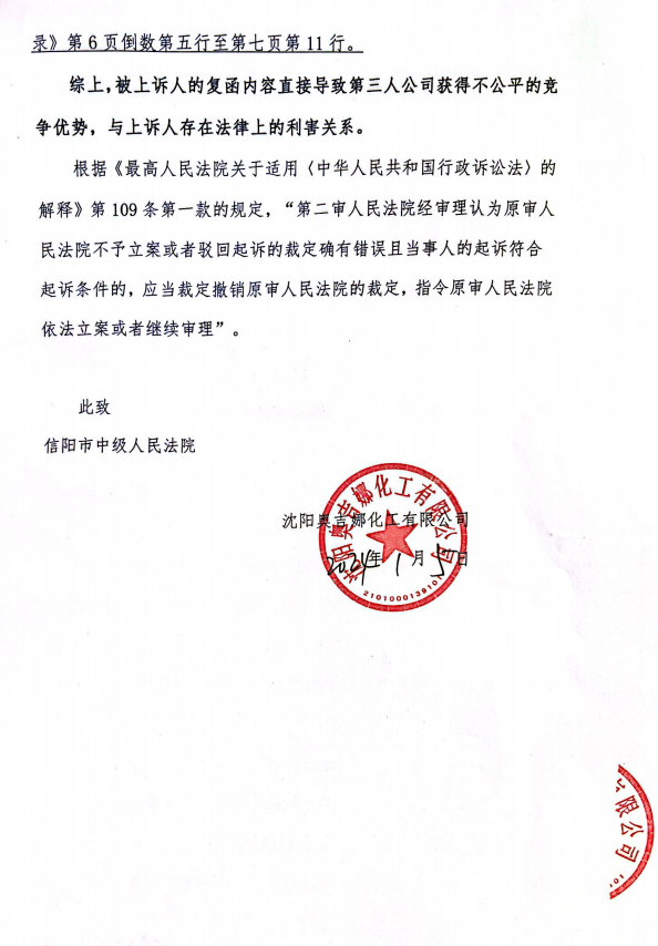 法院的裁定理由是:被告的《信陽市生態(tài)環(huán)境局關于沈陽奧吉娜化工有限公司舉報華陽長青投資有限公司違法經(jīng)營及固始分局不作為、亂作為的問題調(diào)查處理函》(下稱《調(diào)查處理函》)與原告訴請沒有利害關系,因此,原告沒有訴訟資格,下附一:《河南省信陽市平橋區(qū)人民法院行政裁定書》(18頁)。