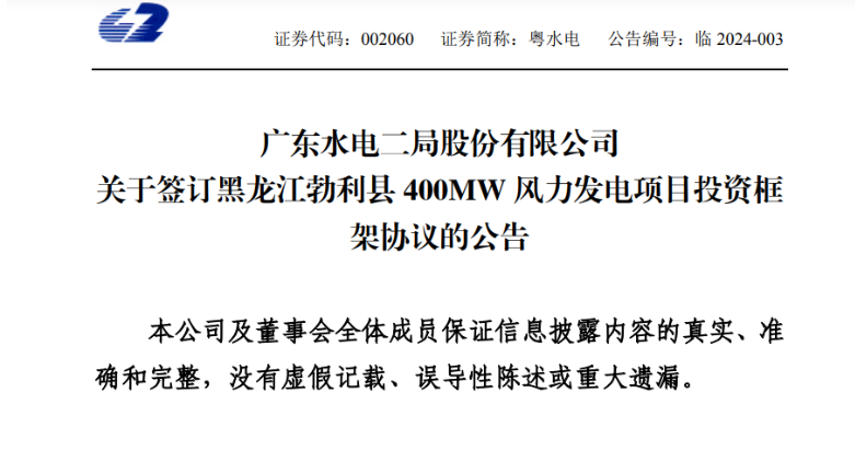 公告披露,2024 年1月11日,粵水電與黑龍江省七臺(tái)河市勃利縣人民政府(以下簡(jiǎn)稱“勃利縣人民政府”)簽訂《勃利縣400MW風(fēng)力發(fā)電項(xiàng)目投資框架協(xié)議》。公司擬在勃利縣境內(nèi)開(kāi)發(fā)裝機(jī)規(guī)模400MW風(fēng)力發(fā)電項(xiàng)目,估算總投資約20億元。