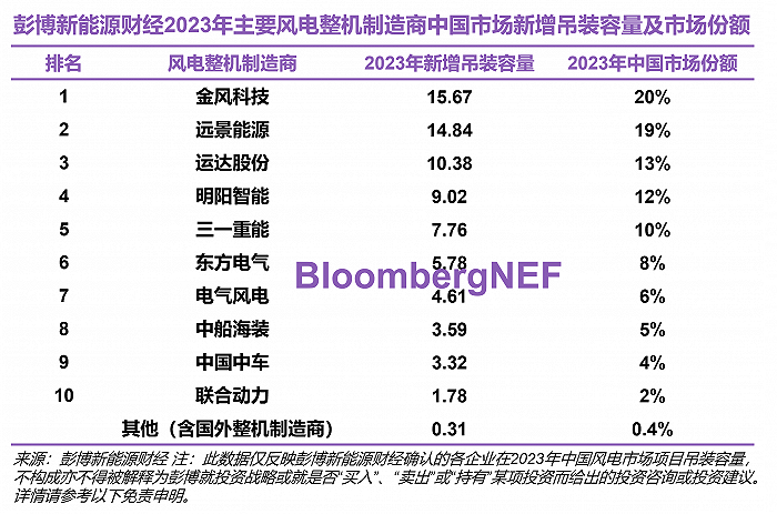 彭博新能源財經(jīng)表示,根據(jù)2023年中國風電新增吊裝容量統(tǒng)計結(jié)果,位列前三的風電整機制造商吊裝容量均超過10 GW。其中金風科技持續(xù)位列第一,遠景能源穩(wěn)居第二并正逐步縮小與第一名的差距。