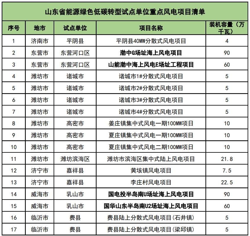 同時,該文件還公布了山東省能源綠色低碳轉(zhuǎn)型試點單位重點項目清單。清單包含24個風(fēng)電項目,總裝機容量785.1萬千瓦,其中海上風(fēng)電項目共計4個,總裝機容量300萬千瓦。