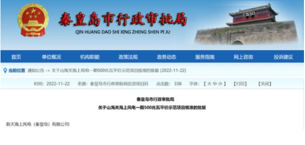 山海關(guān)海上風(fēng)電一期500兆瓦平價(jià)示范項(xiàng)目位于山海關(guān)區(qū)與遼冀界線海域,北鄰山海關(guān)港區(qū),向南輻射至河北省省管海域與國(guó)管海域交界附近,東側(cè)為遼冀海域分界線,西側(cè)為秦皇島港東錨地。項(xiàng)目建設(shè)單位為新天海上風(fēng)電(秦皇島)有限公司,風(fēng)場(chǎng)總?cè)萘繛?00MW,擬設(shè)計(jì)安裝單機(jī)8MW以上風(fēng)機(jī),配建1座220千伏海上升壓站和1座陸上集控中心。項(xiàng)目估算總投資為62.3865億元。