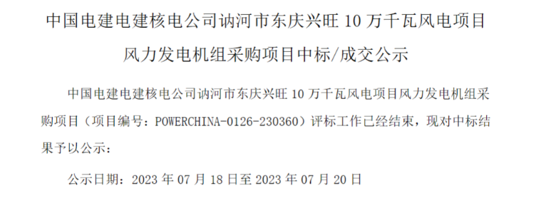 7月18日,中國電建集中采購平臺發(fā)布《中國電建電建核電公司訥河市東慶興旺10萬千瓦風(fēng)電項目風(fēng)力發(fā)電機組采購項目中標(biāo)/成交公示》的公告。