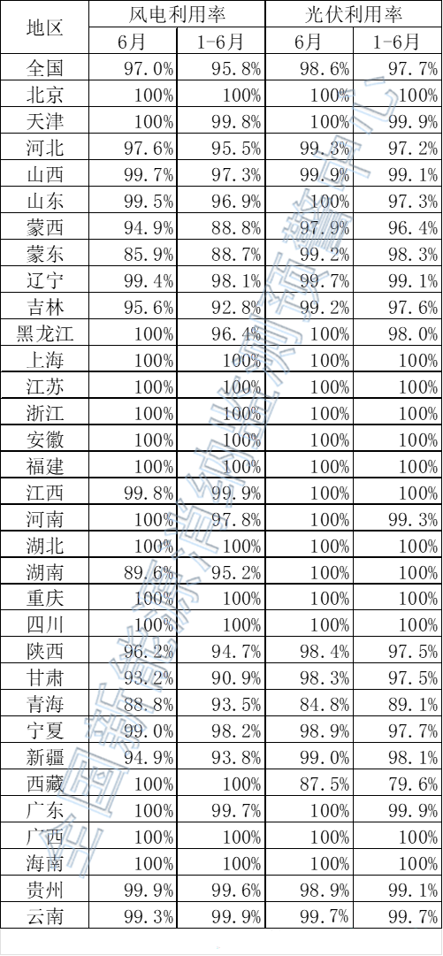數(shù)據(jù)顯示,2022年6月,全國風電、光伏的利用率分別為97%、98.6%;2022年1~6月,全國風電、光伏的利用率分別為95.8%、97.7%。