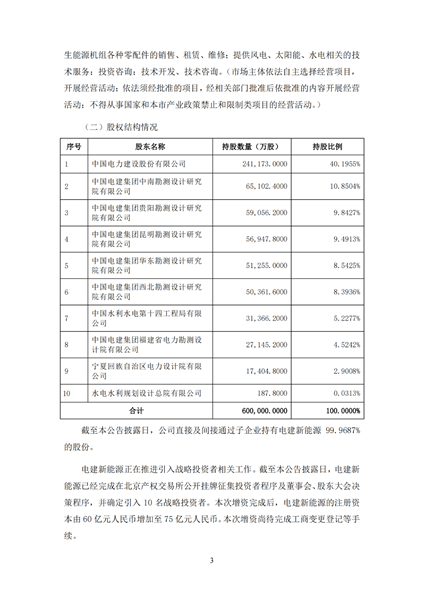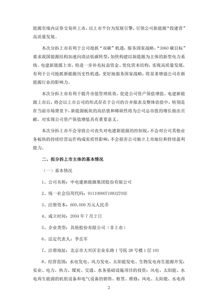 根據(jù)公告,擬拆分的中電建新能源集團股份有限公司注冊資本為60億元,經(jīng)營范圍包括水電發(fā)電、風力發(fā)電、太陽能發(fā)電、生物發(fā)電再生能源開發(fā)等。目前,電建新能源正在推進引入戰(zhàn)略投資者相關工作。