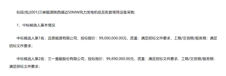 公告顯示,第一中標(biāo)候選人:遠(yuǎn)景能源有限公司,投標(biāo)報(bào)價(jià):99,000,000.00元。第二中標(biāo)候選人:三一重能股份有限公司,投標(biāo)報(bào)價(jià):99,890,000.00元。第三中標(biāo)候選人:明陽(yáng)智慧能源集團(tuán)股份公司,投標(biāo)報(bào)價(jià):104,000,000.00元。