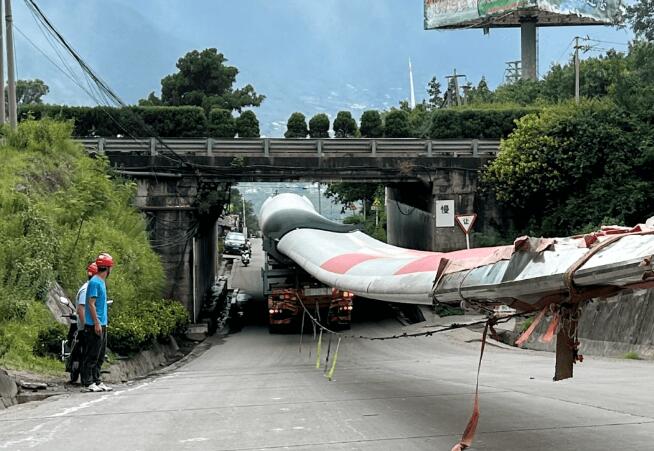 面對轉彎半徑嚴重不足、“卡脖子”橋洞兩道坎,運輸團隊積極與地方政府溝通,提前將“90度分道”拓建為弧形彎道,解決運輸車轉彎半徑不夠的難題。同時,提前進行實地勘測,精確測算過橋洞時葉根、葉尖與橋洞的距離,進一步調整運輸工裝的高度及葉片運輸姿態(tài),從而保障了B973A型葉片順利通過橋洞。