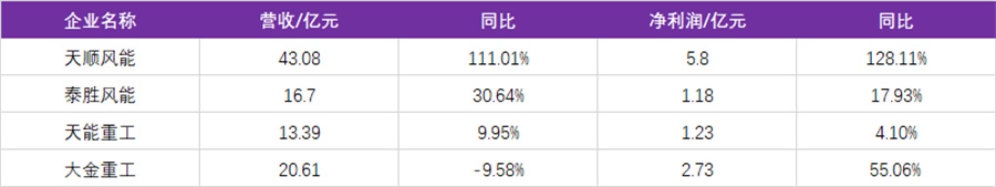 中國(guó)風(fēng)電塔筒4大龍頭企業(yè)天順風(fēng)能、泰勝風(fēng)能、大金重工、天能重工2023年上半年成績(jī)單公布,4家總營(yíng)收93.78億元,總凈利潤(rùn)10.94億元。除大金重工外營(yíng)收出現(xiàn)下滑外,其余3家企業(yè)營(yíng)收及凈利潤(rùn)均同比上年出現(xiàn)上漲。具體情況如下: