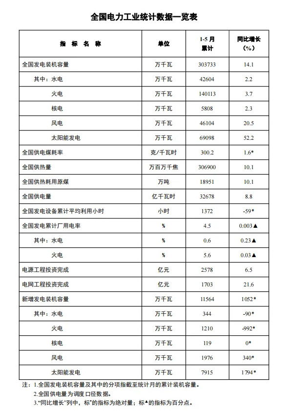 截至5月底,全國累計(jì)發(fā)電裝機(jī)容量約30.4億千瓦,同比增長14.1%。其中,太陽能發(fā)電裝機(jī)容量約6.9億千瓦,同比增長52.2%;風(fēng)電裝機(jī)容量約4.6億千瓦,同比增長20.5%。