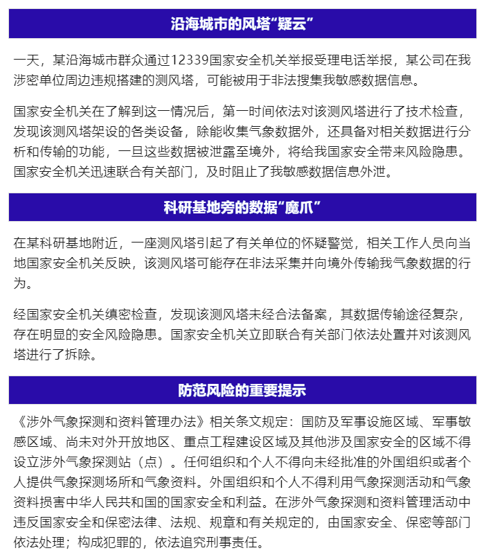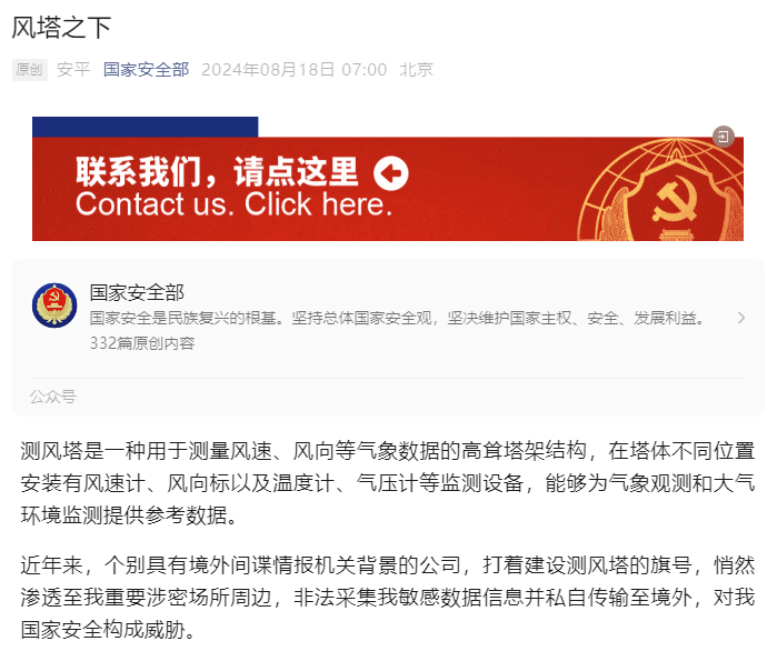 8月18日,據(jù)國家安全部官微消息,近年來,個別具有境外間諜情報機關(guān)背景的公司,打著建設風電測風塔的旗號,悄然滲透至我重要涉密場所周邊,非法采集我敏感數(shù)據(jù)信息并私自傳輸至境外,對我國家安全構(gòu)成威脅。