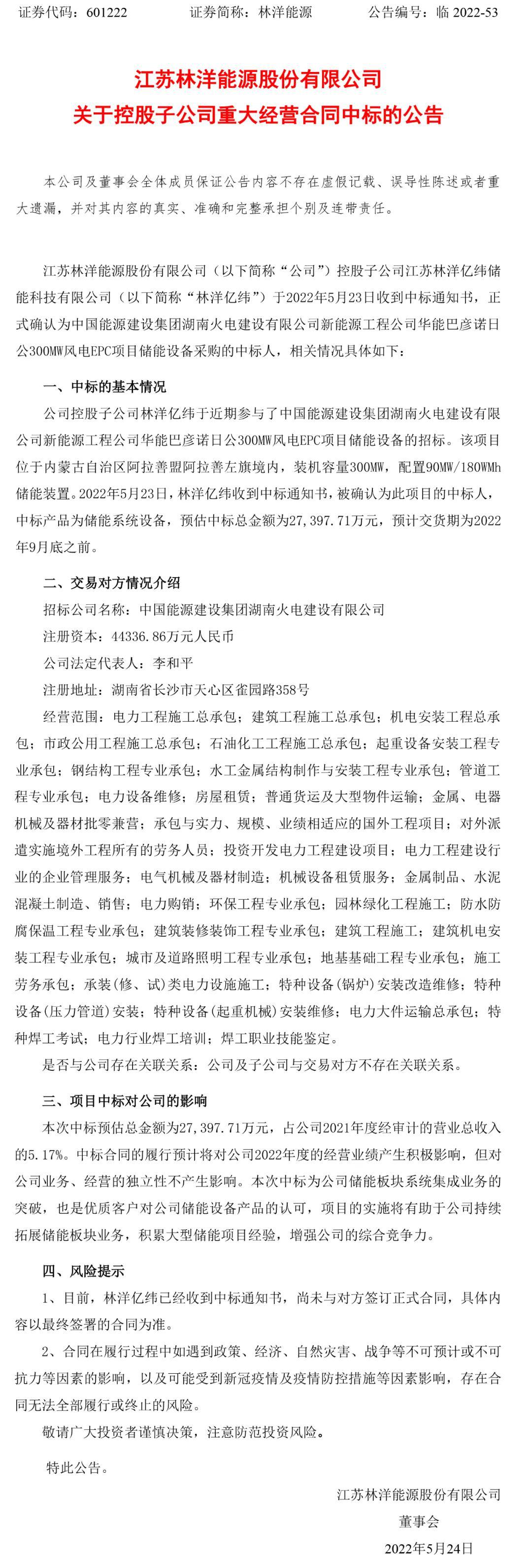 5月23日晚間,林洋能源(601222)(601222.SH)發(fā)布公告,公司控股子公司江蘇林洋億緯儲(chǔ)能科技有限公司正式中標(biāo)中國(guó)能源建設(shè)集團(tuán)湖南火電建設(shè)有限公司新能源工程公司華能巴彥諾日公300MW風(fēng)電EPC項(xiàng)目?jī)?chǔ)能設(shè)備采購,預(yù)估中標(biāo)總金額為2.74億元。