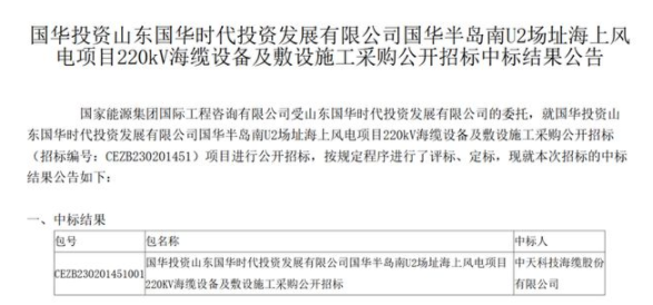 近日,國家能源招標(biāo)網(wǎng)發(fā)布《國華投資山東國華時代投資發(fā)展有限公司國華半島南U2場址海上風(fēng)電項目220kV海纜設(shè)備及敷設(shè)施工采購公開招標(biāo)中標(biāo)結(jié)果公告》。公告顯示,中天科技海纜股份有限公司成功中標(biāo)該項目,中標(biāo)價格為42111.942000萬元。
