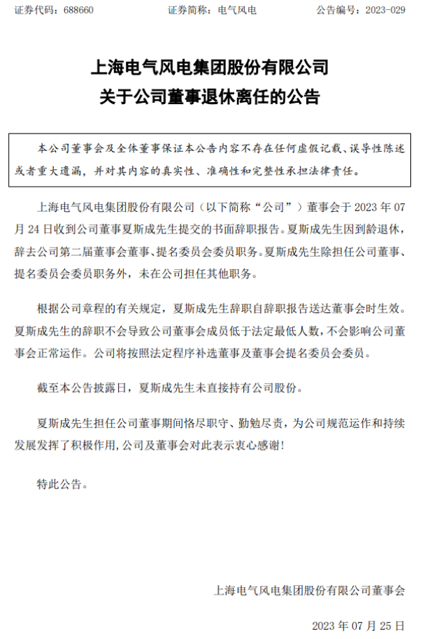 7月25日,上海電氣風(fēng)電集團(tuán)股份有限公司(簡(jiǎn)稱“電氣風(fēng)電”)發(fā)布《關(guān)于公司董事退休離任的公告》。