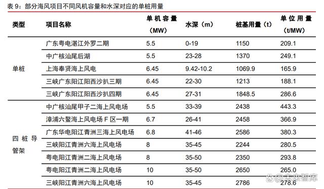 風(fēng)電大型化和深海化推動樁基、塔筒單機(jī)用量增長。據(jù)海力風(fēng)電招股書,適用于 0- 24m 水深單機(jī)容量 4MW 的單樁基礎(chǔ)重量在每臺 550-1000 噸之間;水深 30m 以上單機(jī) 容量 5MW 使用的四樁導(dǎo)管架基礎(chǔ)重量為 243 噸。以三峽陽江沙扒三期和三峽陽江青洲六 項(xiàng)目對比測算樁基塔筒單機(jī)用量,陽江沙扒三期安裝單機(jī)容量 6.45MW 風(fēng)機(jī) 62 臺,陽江 青洲六分別安裝 8MW 和 10MW 容量風(fēng)機(jī) 25 和 80 臺,風(fēng)機(jī)葉片直徑、輪轂高度數(shù)值均增 大,單臺塔筒和樁基用量為 734 噸和 2657 噸,較淺水域小容量風(fēng)機(jī)項(xiàng)目對應(yīng)的 380 噸和 1693 噸用量提升。