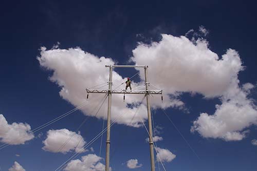 項目架空線路桿塔共計668基,12種桿塔型式。桿塔是在35kV架空線路架設,線路總長度約122.21km,塔高為15-21米,屬于高空作業(yè)。施工現場干旱炎熱,沙塵暴和冰雹也常常輪番“光顧”,給施工進度和安全管理帶來不小的挑戰(zhàn)。在桿塔組立作業(yè)前,項目部組織協作隊伍召開專題安全會,施工隊長徐少帥堅持對現場的施工操作人員進行詳細的安全、技術、質量交底工作;質量安全科林周彬堅持每天現場巡查,要求高空作業(yè)人員必須持證上崗,且具有合格的體檢報告;施工過程中,施工現場拉起安全警戒線、懸掛安全警示標識,安全員全程旁站監(jiān)督,確?,F場施工安全質量可控。