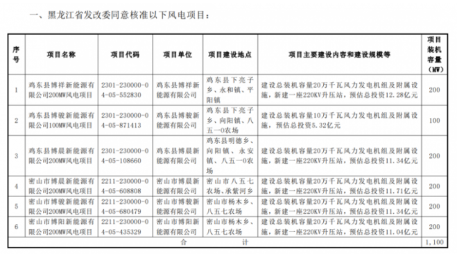 公告披露,寧夏嘉澤新能源股份有限公司下屬公司于日前收到了黑龍江省發(fā)展和改革委員會(huì)(以下簡(jiǎn)稱“黑龍江省發(fā)改委”)出具的風(fēng)電項(xiàng)目核準(zhǔn)的批復(fù)文件,共計(jì)六個(gè)風(fēng)電項(xiàng)目獲得核準(zhǔn),總裝機(jī)容量為1100MW。
