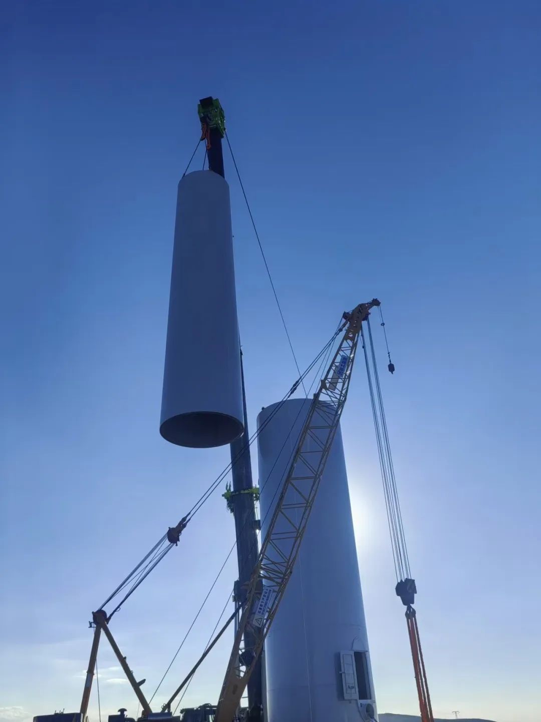 該項(xiàng)目位于新疆維吾爾自治區(qū)昌吉回族自治州木壘縣大石頭村一帶,距離木壘縣約70千米處,場址海拔1400-2100米,場址為低中山丘陵地貌,地勢開闊,地形起伏。該項(xiàng)目單機(jī)容量10兆瓦,是陸上單機(jī)容量最大的風(fēng)電機(jī)組,單機(jī)共5段,其中T1、T2段為分片式塔架,輪轂高度118米,單段最大重量約111噸。