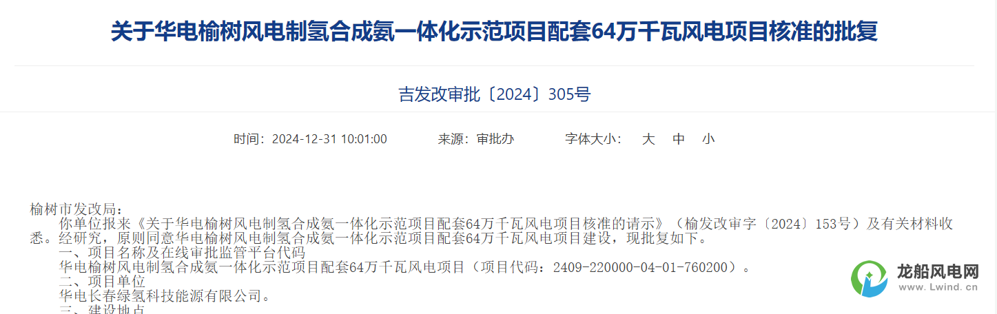 近日,吉林省發(fā)展和改革委員會發(fā)布關(guān)于華電榆樹風(fēng)電制氫合成氨一體化示范項(xiàng)目配套16萬千瓦風(fēng)電項(xiàng)目、華電榆樹風(fēng)電制氫合成氨一體化示范項(xiàng)目配套64萬千瓦風(fēng)電項(xiàng)目核準(zhǔn)的批復(fù)。