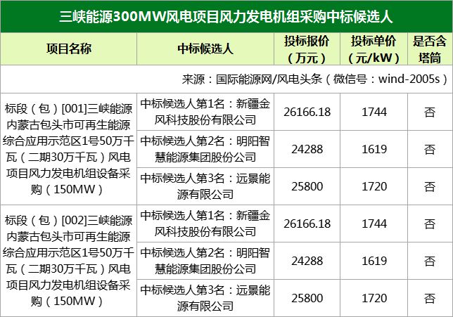 三峽能源內(nèi)蒙古包頭市可再生能源綜合應(yīng)用示范區(qū)1號50萬千瓦(二期30萬千瓦)風(fēng)電項目分為兩個標(biāo)段,標(biāo)段一和標(biāo)段二中標(biāo)候選人分別為金風(fēng)科技、明陽智能、遠景能源。