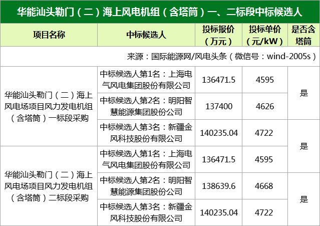 華能汕頭勒門(二)海上風(fēng)電場項目風(fēng)力發(fā)電機組(含塔筒)采購一、二標(biāo)段中標(biāo)候選人分別為上海電氣、明陽智能、金風(fēng)科技。