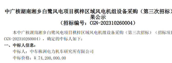 1月2日,中廣核電子商務(wù)平臺(tái)發(fā)布《中廣核湖南湘鄉(xiāng)白鷺風(fēng)電項(xiàng)目棋梓區(qū)域風(fēng)電機(jī)組設(shè)備采購(gòu)(第三次招標(biāo))中標(biāo)結(jié)果公示》的公告。
