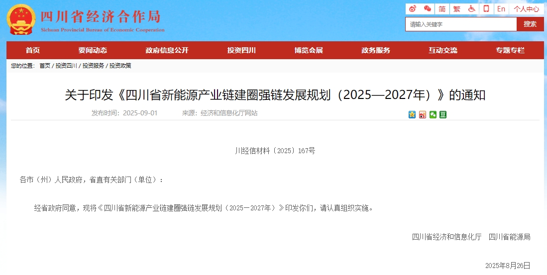 近日,四川省經(jīng)濟和信息化廳聯(lián)合省能源局印發(fā)《四川省新能源產(chǎn)業(yè)鏈建圈強鏈發(fā)展規(guī)劃(2025—2027年)》(以下簡稱《規(guī)劃》)?!兑?guī)劃》聚焦光伏、風電、氫能、新型儲能等重點領(lǐng)域的產(chǎn)業(yè)發(fā)展綜合實力提升,提出到2027年,四川省新能源產(chǎn)業(yè)鏈營業(yè)收入超過5000億元,力爭達到6000億元的發(fā)展目標。