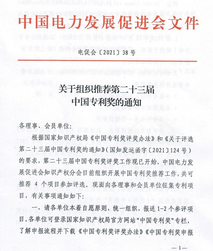 根據(jù)國家知識產(chǎn)權(quán)局《中國專利獎評獎辦法》和《關(guān)于評選第二十三屆中國專利獎的通知》(國知發(fā)運函字〔2021〕124號)的要求,第二十三屆中國專利獎評獎工作現(xiàn)已開始,中國電力發(fā)展促進會知識產(chǎn)權(quán)分會目前組織開展中國專利獎推薦工作,共可推薦4個項目參加評選?,F(xiàn)面向各理事和會員單位征集專利項目,有關(guān)事項通知如下: