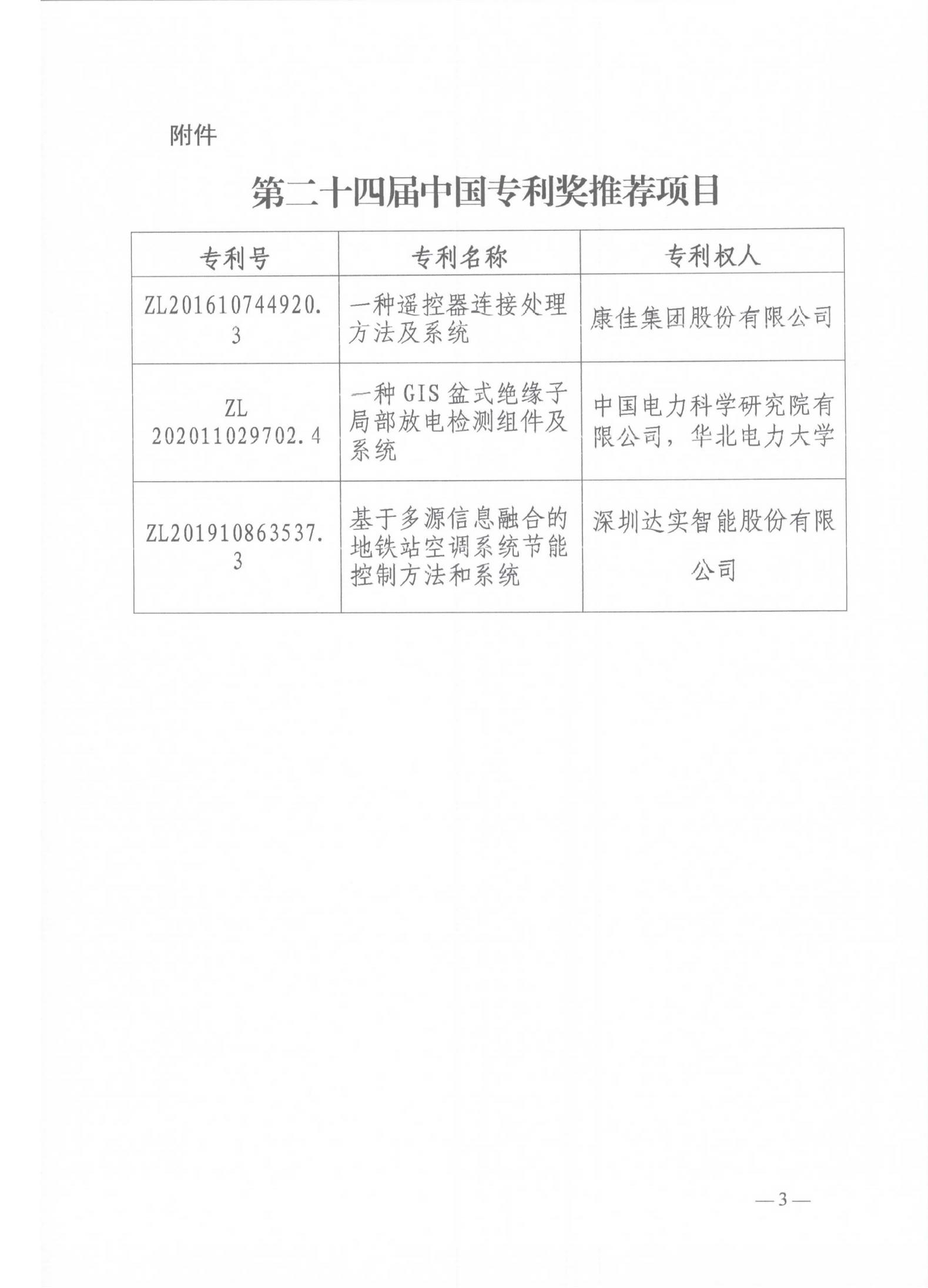 關(guān)于公示第二十四屆中國(guó)專利獎(jiǎng)推薦項(xiàng)目的通知
