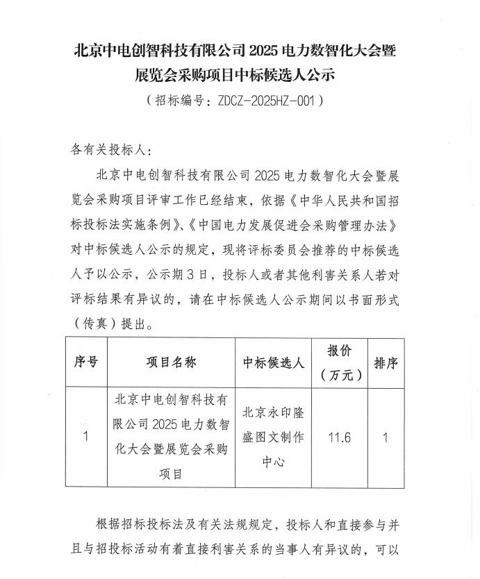 北京中電創(chuàng)智科技有限公司2025電力數(shù)智化大會暨展覽會采購項(xiàng)目中標(biāo)候選人公示