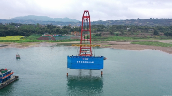 3月18日,3000噸深艙駁船載著金剛沱泵站取水頭部上部結(jié)構(gòu)航行至指定水域停泊,隨著吊裝總指揮一聲令下,350噸浮吊船主繩緩緩下落將取水頭部上部結(jié)構(gòu)吊入水下與下部結(jié)構(gòu)成功對接,完成了長江取水頭部水下安裝,標(biāo)志著金剛沱泵站取水工程邁出了關(guān)鍵的一步。