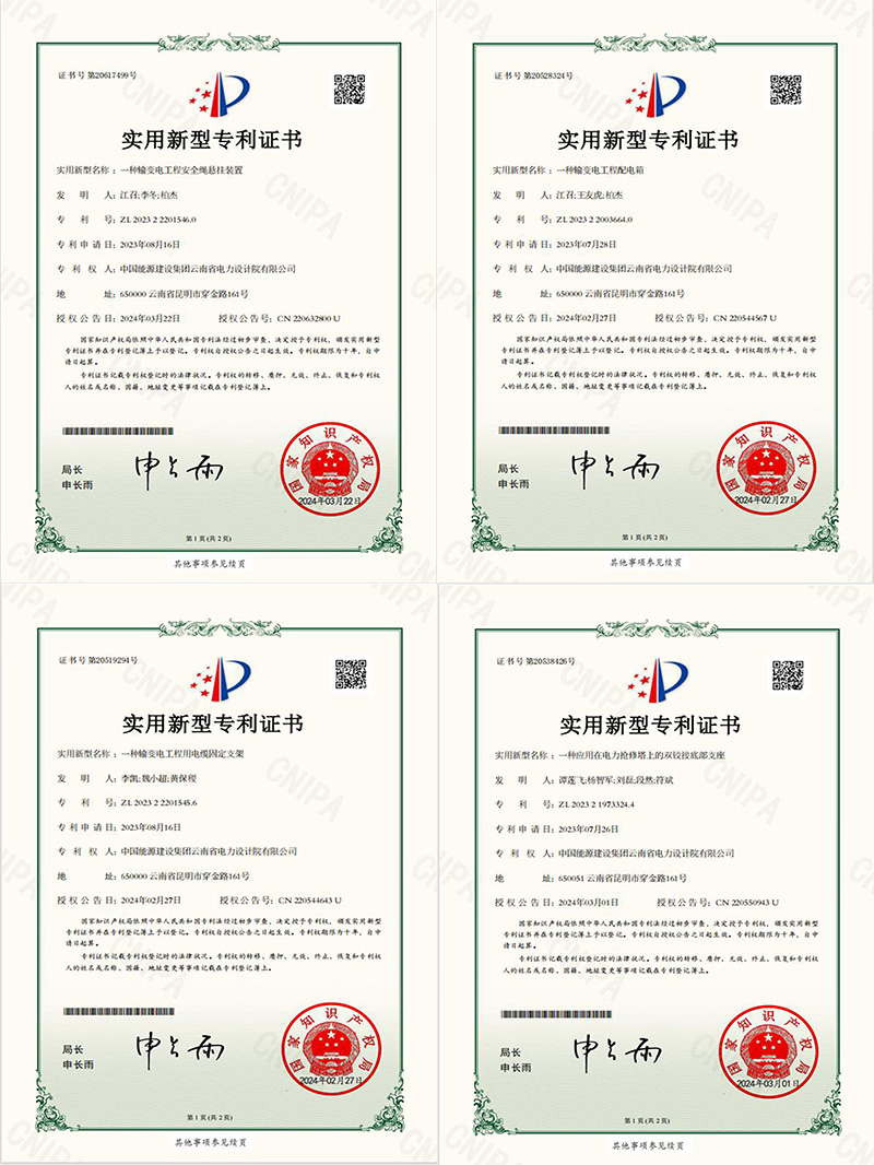 近日,由中國能建中電工程云南院獨立研發(fā)的“一種輸變電工程配電箱”“一種應用在電力搶修塔上的雙鉸接底部支座”“一種輸變電工程用電纜固定支架”“一種輸變電工程安全繩懸掛裝置”四項成果獲得國家實用新型專利。