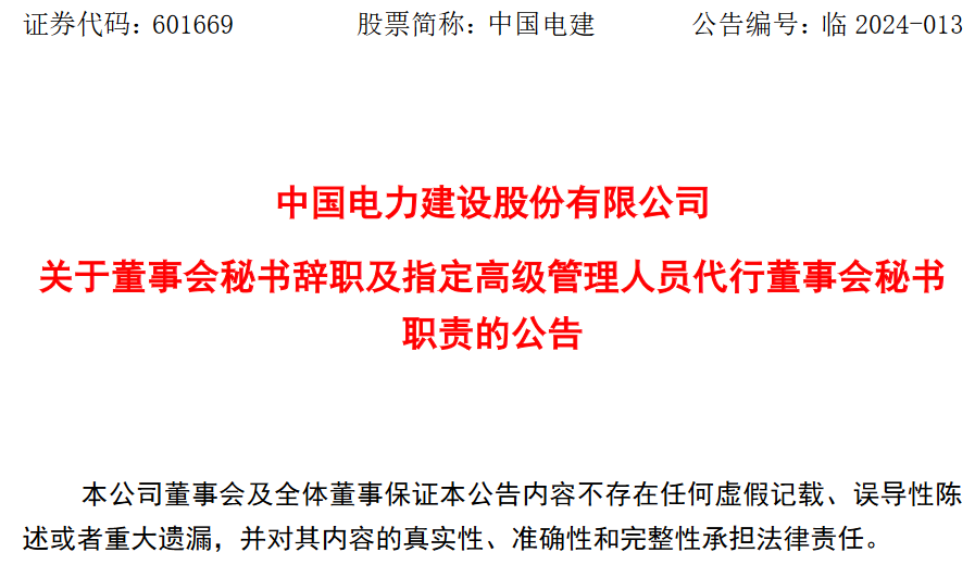 中國電建發(fā)布公告稱,中國電力建設(shè)股份有限公司(以下簡稱“公司”)董事會秘書丁永泉先生因年齡原因(退休)已向公司董事會遞交書面辭職報告,申請辭去公司董事會秘書職務(wù)。