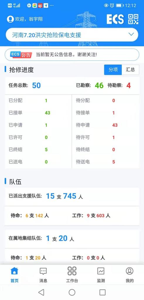 ECS系統(tǒng)及閩電應急app曾在防抗2020年第6號臺風“米克拉”、2019年第11號臺風“白鹿”等事件中出色完成國網(wǎng)福建電力抗臺保電任務,作為應急管理系統(tǒng)的一名“老手”,ECS系統(tǒng)及閩電應急app在河南電網(wǎng)搶修這個“新戰(zhàn)場”完成了優(yōu)化升級,在短短兩天內(nèi)針對河南現(xiàn)場搶修特點上線新模塊,模塊支持跨省隊伍調(diào)派、任務單下發(fā)、現(xiàn)場信息勘察及回傳、物資需求提報以及搶修信息統(tǒng)計等功能。