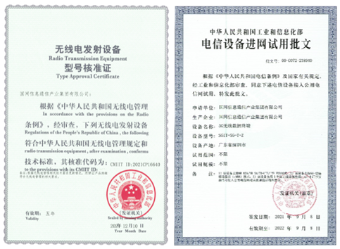 圖 1 電力5G 增強(qiáng)型通信終端獲得型號(hào)核準(zhǔn)證及進(jìn)網(wǎng)許可證