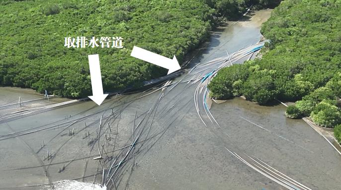 ▲圖5 2023年11月22日,督察組現(xiàn)場督察使用無人機(jī)拍攝,養(yǎng)殖塘取排水設(shè)施穿越清瀾紅樹林省級自然保護(hù)區(qū)核心區(qū)
